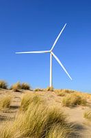 Windturbine in de duinen tijdens zonsondergang op het Maavlakte Noordzeestrand tijdens een rustige dag in Zuid-Holland in Nederland.