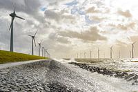Windmolenpark met rijen windturbines zowel op land als op zee tijdens een winterstorm aan de oever van het IJsselmeer in de Noordoostpolder, Flevoland, Nederland.