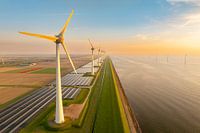 Rijen windturbines en zonnepanelen op de IJsselmeeroever en offshore windturbines op de achtergrond in de Noordoostpolder in Flevoland, Nederland, tijdens een voorjaarszonsondergang van bovenaf gezien.