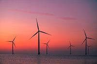 Windturbines die duurzame duurzame energie produceren in een offshore windpark in Flevoland, De Netehrlands, tijdens zonsondergang. Drone standpunt.