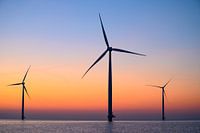 Windturbines die duurzame hernieuwbare energie produceren in een offshore windpark in Flevoland, De Netehrlands, tijdens zonsondergang met rustig water op de voorgrond en een kleurrijke lucht op de achtergrond.