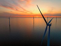 De windturbines staan in het IJsselmeer aan de kust van Flevoland.