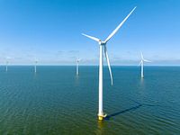 Windturbines in het IJsselmeer in de Noordoostpolder in Flevoland, Nederland, in de lente van bovenaf gezien.