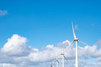 Windturbines die duurzame hernieuwbare energie produceren tijdens een winderige maar zonnige dag met een blauwe lucht en wolken op de achtergrond. De windturbines staan in Flevoland, Nederland, waar de meeste windturbines op land in Nederland te vinden zijn.