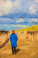 Een vrouw in een opvallend blauwe jas wandelt resoluut over het strandpad, geflankeerd door houten golfbrekers die het perspectief versterken. Haar rug naar de kijker roept een gevoel van rust, reflectie en beweging op. Boven haar zweven kleurrijke paragliders in een lucht die…