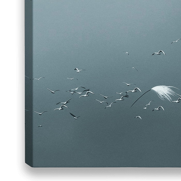 Minimalistische digitale kunst van een sereen, mistig landschap met pluizige witte zaadpluisjes op dunne stengels en een zwerm vogels die opvliegt tegen een zachte grijsblauwe achtergrond.