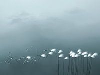 Minimalistische digitale kunst van een sereen, mistig landschap met pluizige witte zaadpluisjes op dunne stengels en een zwerm vogels die opvliegt tegen een zachte grijsblauwe achtergrond.