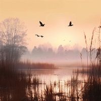 Vredig landschap bij zonsopgang, waar de lucht in warme oranje en roze tinten is gehuld. De silhouetten van vogels in vlucht voegen een dynamisch element toe aan het serene tafereel.