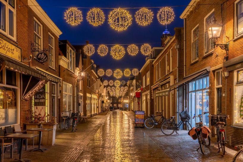 Een winkelstraat in kerstsfeer in IJsselstein (Utrecht, Nederland). Door de kerstverlichting ontstond een mooie sfeer. De vochtige stenen zorgden voor een fraaie reflectie.