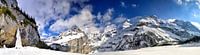 Wijds panorama van de bevroren Oeschinensee in de Bernese Oberland regio in de Zwitserse Alpen met een bevroren waterval aan de linkerkant.