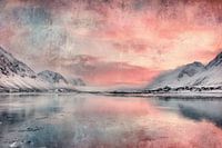 Dit fine art landschap toont een bergmeer omringd door besneeuwde bergtoppen. Het water weerspiegelt de zonsondergang, terwijl aan de oever kleine berghutten staan tussen sneeuw en ijs. De combinatie van winterse bergen, kalm water en pastellicht geeft het werk een rustig en dromerig karakter. Een sfeervol kunstwerk dat rust brengt en…