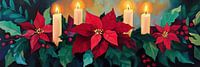 Winter Bloemen | Kerstster Kaarsen - Dit kerst schilderij toont levendige rode kerststerren met groene bladeren en vijf brandende kaarsen die een warme gloed verspreiden op een donkere achtergrond.