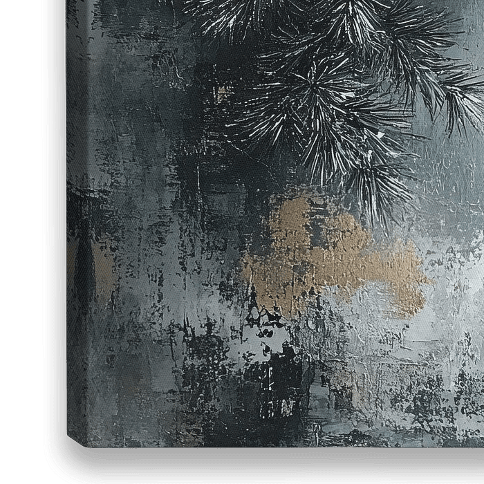Winter Decor | Feestdagen Decor Textuur - Dit Kerstmis schilderij toont twee gouden kerstballen en een takje dat hangt tegen een grijze en blauwe achtergrond, die textuur en een diep gevoel van winterse kou uitstraalt.