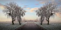 Winterscene met rijp en mist in deze composiet foto van het gehucht Eyserheide in het Zuid-Limburgse Heuvelland.