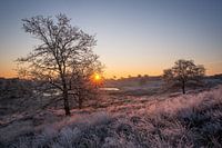 Een koude winterochtend bij Het Quin in natuurpark de Maasduinen in Limburg. De heide was bedekt met rijp en de ochtendzon gaf een mooie gloed/ licht op het rijp, heide.