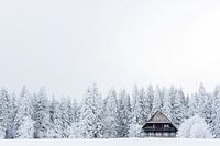 Deze foto is geïnspireerd op de allure van afgelegen winterse ontsnappingen en omvat de schoonheid van eenzaamheid en de warmte van het terugtrekken in een knusse hut terwijl je wordt omringd door de ongerepte pracht van de natuur. Het beeld is perfect voor diegenen die een gevoel van rust, sereniteit en het knusse comfort van de winter in hun huis of werkruimte willen brengen.