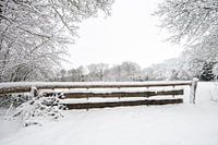 Dit typische hek steekt mooi af tegen de witte sneeuwdeken.
