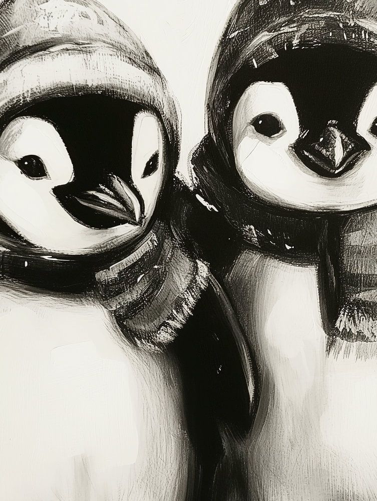 Een zwart/wit portret van 2 pinguins met muts en sjaal. Cartoon style.