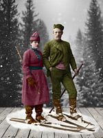 Dit winterse tafereel toont een prachtig gekleed stel uit de pionierstijd van het skiën. De dame straalt in haar elegante bordeauxrode kleding met een bijpassende hoed, terwijl de heer er dandy uitziet in zijn groene tweed-achtige pak. Samen poseren ze trots met hun houten ski's en stokken in een winters boslandschap. Of liever gezegd: vóór een winters boslandschap, want er is veel in scene gezet ;-)