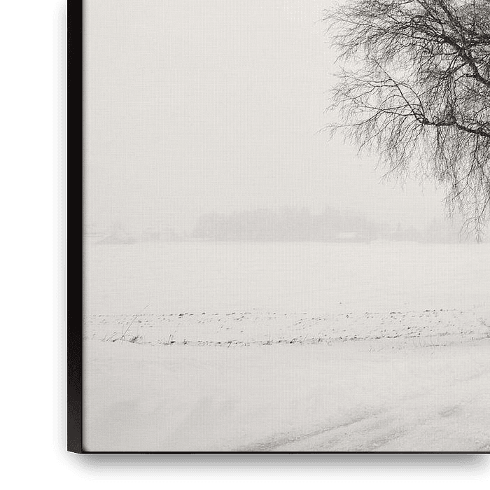 Minimalistische, ruhige Winterlandschaft mit Straße und Baumallee in Schwarz-Weiß.