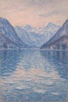 Een stil meer strekt zich uit tussen stille bergkammen, de lucht kristalhelder, de wereld verstild in tinten blauw en zilver. Dit schilderij roept de stille transcendentie van de winter in de hoge Alpen op - een landschap dat zweeft tussen aarde en lucht. Geïnspireerd door Claude Monet's meditatieve studies van het licht in de natuur,…