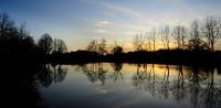 Reflectie van kale bomen in een vijver. Erachter is de zon net onder gegaan en kleurt de lucht goud. In midwinter staat de zon hier op zijn meest zuidelijke plek aan de horizon.