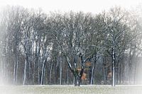 Kale bomen langs een weiland in de winter met stuifsneeuw tegen één kant van de bomen. De stuifsneeuw vormt zich als een soort skelet langs de stammen en takken van de bomen.
