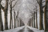Lange bomenlaan in een winters landschap