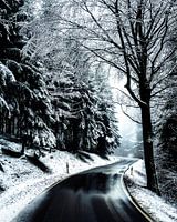 Volg de weg door een magisch, besneeuwd winterlandschap
