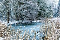 Foto van winterlandschap met sneeuw bij bevroren vijver in bos in Zwaben in Duitsland