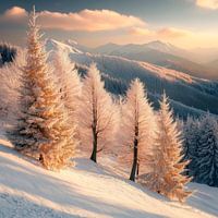 Een winterdroom ontvouwt zich: majestueuze, met sneeuw bedekte bomen staan trots in zachte pastelkleuren. De gouden zon kust de bevroren takken, terwijl majestueuze bergen op de achtergrond de hemel in torenen. Er hangt een gevoel van vrede en rust in de lucht, alsof de natuur de tijd heeft stilgezet en ons in haar magische omhelzing…