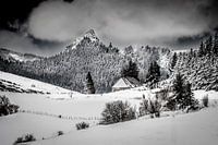 Een winter tafereel met een boerderij midden in de sneeuw en "la Roche Sanadoire" op de achtergrond in de Auvergne, Frankrijk.