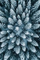 Er ontvouwt zich een winterwonderland waar de dennenbomen gehuld zijn in stralend wit. Hun tere toppen reiken tot in de hemel, terwijl de glinsterende sneeuw ze bedekt in een zachte deken. De symmetrische opstelling van de bomen creëert een bijna hypnotiserende rust die een gevoel van eenzaamheid en vrede uitstraalt.