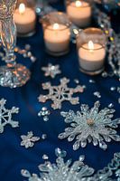 Een fonkelende zee van glinsterende sneeuwvlokken, omlijst door zacht kaarslicht, voegt een magisch tintje toe aan elke feestelijke tafel. Het diepblauwe tafelkleed vormt een elegant contrast met de kristallen accenten en doet denken aan ijzige winterdagen. Perfect voor een stijlvolle woonkamer of voor feestelijke gelegenheden, deze decoratie brengt sfeer en glamour in elke kamer.
