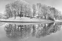 Winterlandschap in de Friese hoofdstad Leeuwarden langs de stadsgracht met de Oldehove en het PierPander museum in zwart/wit