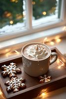 Een dampende kop warme chocolademelk, overgoten met een wolkje room, creëert een gezellige wintersfeer. Omringd door zachte, twinkelende lichtjes en verleidelijke koekjes met sneeuwvlokken is de sfeer vervuld van warmte en feestelijke verwachting. Het uitzicht vanuit het raam nodigt je uit om te genieten van het winterwonderland en de…