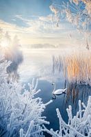 In een ijzig winterlandschap wordt het zachte licht van de zonsopgang weerspiegeld in het glinsterende water, terwijl een elegante zwaan majestueus over de bevroren oever glijdt. De delicate ijskristallen en de kalme blauwe kleur creëren een dromerige sfeer die perfect is om in de slaapkamer te dromen van kou en rust.