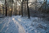 Winterzon in een besneeuwd bos ergens in Neder-Franken