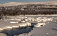 Een laag sneeuw drijft op het water, en ligt op de stenen van een meer in Fins Lapland.