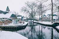 Giethoorn met de grachten met sneeuw tijdens een koude maar mooie rustige winterdag. Giethoorn is een dorp in Overijssel en beroemd om zijn grachten.
