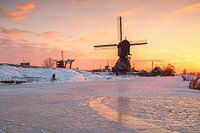 Winterse zonsopkomst in Kinderdijk bij de Blokweer museum molen.