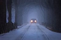 Winter in Nederland, Dordrecht, polder. Een winterlandschap op een dijk in de sneeuw. Sfeervolle, beetje dromerige opname tijdens de schemering. Bomen langs de dijk en de koplampen van een auto in de verte.