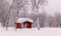Een klein hutje in het bos in het midden van de winter, nabij de poolcirkel in Noorwegen.