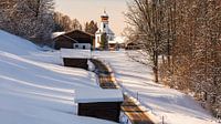 Winter in Wamberg, en het uitzicht op de kerk van St. Anna. Wamberg is een van de hoogst gelegen kerkdorpen van Duitsland en ligt dicht bij de stad Garmisch-Partenkirchen, in Beieren, Zuid Duitsland.