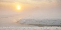 Winter in de Alblasserwaard. De mist, sneeuw en zonlicht zorgen voor een winterse sfeer in deze foto. In tegenlicht komt de sfeer van de laatste zonnestralen goed tot uitdrukking en maakt het landschap zacht en romig.