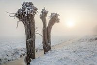 Winter in de Alblasserwaard. De mist, sneeuw en zonlicht zorgen voor een winterse sfeer in deze foto. De zon doet moeite om door de mistbanken heen te komen. De knotwilgen staan vol ongeduld op de zonnestralen te wachten.