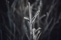 Winterse taferelen in duingebied bij Noordwijk. Bevroren tak met ijsvorming. IJskristallen bij zonsopgang gefotografeerd.