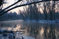 Winter in de Hollandse Biesbosch, Zuid-Holland. IJs en sneew en overhangende bomen op een koude ochtend in Dordrecht.