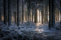 Deze foto is gemaakt bij Signal de Botrange, het hoogste punt van België. Door de hoogte valt hier nog elke winter een goed pak sneeuw, zo ook op de dag dat ik er was. Het zonlicht tussen de bomen verlicht mooi een pad van sneeuw.