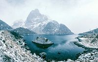 Het water van de fjord is donker en spiegelend en weerkaatst zwakke lichtflitsen die door de bewolkte lucht gluren. Sneeuwvlokken landen zachtjes op het wateroppervlak, rusten even uit voordat ze verdwijnen in de koude diepte. Het omringende landschap is een mix van sterke contrasten - de pure witte sneeuw bedekt het ruige terrein en benadrukt de rauwe schoonheid van de fjord.